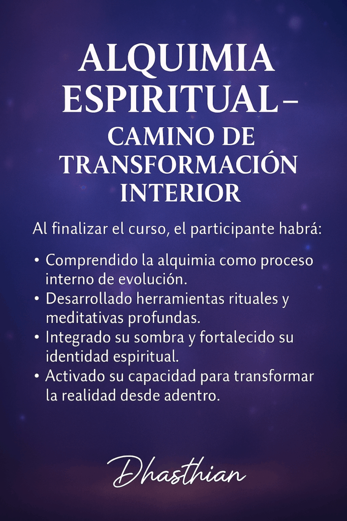 Este curso explora la alquimia como proceso de transmutación del alma, brindando herramientas espirituales, prácticas rituales y enseñanzas para integrar la sombra, despertar la conciencia y transformar la realidad desde el interior.