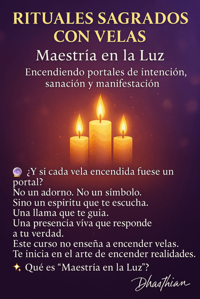Una formación iniciática que transforma cada vela encendida en un verdadero portal sagrado. Este curso te revela el arte ancestral de trabajar con el fuego como entidad viva. Aprenderás a crear rituales profundos de intención, sanación, liberación y manifestación, invocando colores, símbolos, altares personales y el alma de cada llama. No es solo magia, es una maestría espiritual en la Luz.