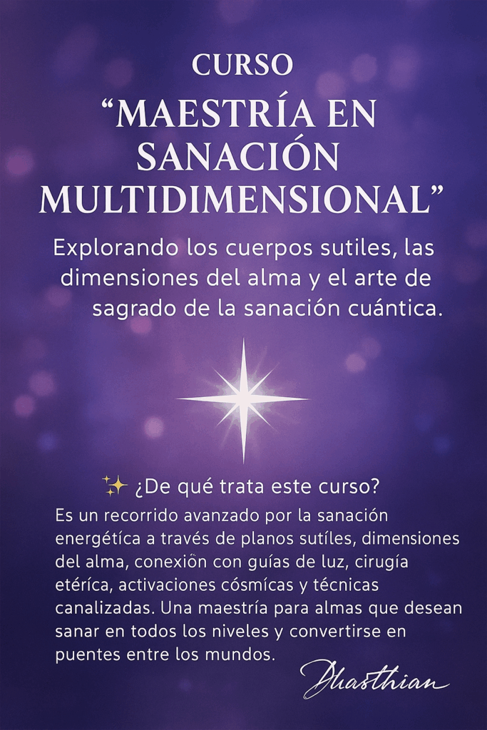 Un recorrido iniciático por los planos sutiles del ser. Esta formación te guía a explorar los cuerpos energéticos, las dimensiones del alma y los caminos de sanación cuántica. Aprenderás a realizar cirugías etéricas, activaciones cósmicas, limpiezas multidimensionales, canalizaciones de alta frecuencia y mucho más. Si sentís el llamado de convertirte en un sanador del alma, este es tu templo.
