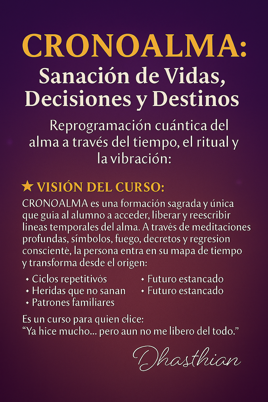 Una formación iniciática y cuántica para transformar tu historia personal. Este curso te guía a viajar por tus líneas del tiempo, liberar patrones, cerrar ciclos kármicos y activar nuevas decisiones sagradas. Trabajamos con símbolos, fuego ritual, meditaciones profundas y regresión guiada para sanar desde la raíz.