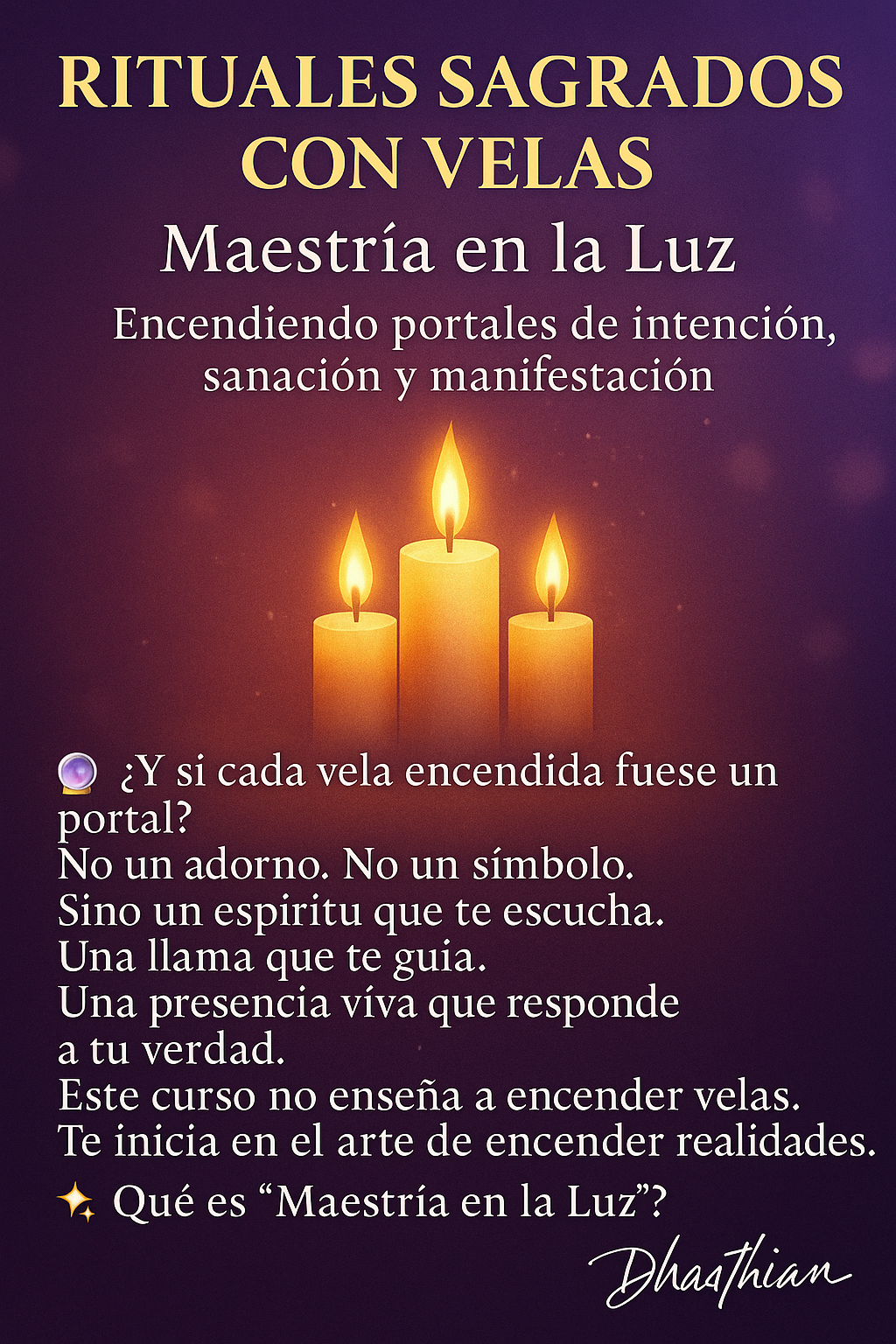 Una formación iniciática que transforma cada vela encendida en un verdadero portal sagrado. Este curso te revela el arte ancestral de trabajar con el fuego como entidad viva. Aprenderás a crear rituales profundos de intención, sanación, liberación y manifestación, invocando colores, símbolos, altares personales y el alma de cada llama. No es solo magia, es una maestría espiritual en la Luz.